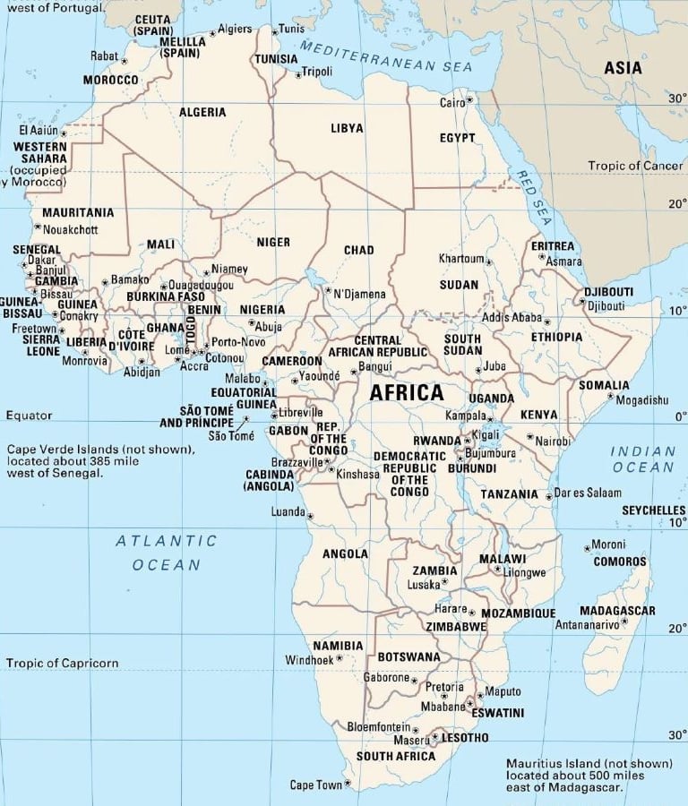 Location: is the second largest continent (after Asia), covering above one-fifth of the total land surface of the Earth, bounded on the west by the Atlantic Ocean, on the north by the Mediterranean Sea, on the east by the Red Sea and the Indian Ocean, and on the south by the mingling of the Atlantic and Indian Oceans